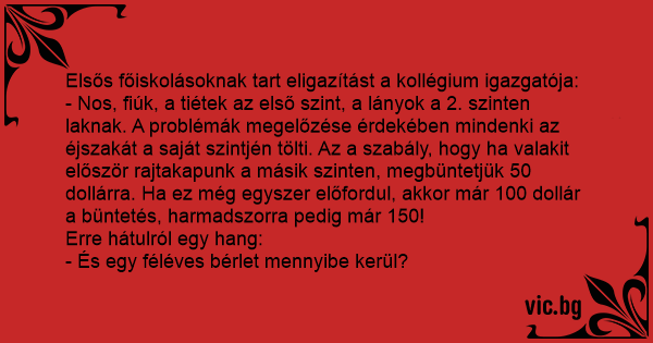 - Nos, fiúk, a tiétek az első szint, a lányok a 2. szinten laknak. A problémák megelőzése érdekében mindenki az éjszakát a saját szintjén tölti. Az a szabály, hogy ha valakit először rajtakapunk a másik szinten, megbüntetjük 50 dollárra. Ha ez még egyszer előfordul, akkor már 100 dollár a büntetés, harmadszorra pedig már 150!