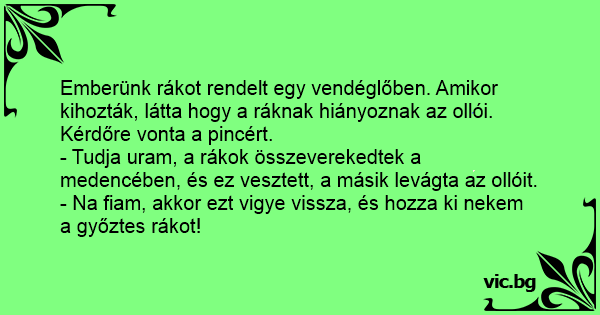 - Na fiam, akkor ezt vigye vissza, és hozza ki nekem a győztes rákot!