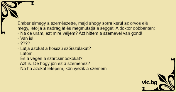 Ember elmegy a szemészetre, majd ahogy sorra kerül az orvos elé megy, letolja a nadrágját és megmutatja a seggét. A doktor döbbenten: