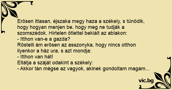 Erősen ittasan, éjszaka megy haza a székely, s tűnődik, hogy hogyan menjen be, hogy meg ne tudják a szomszédok. Hirtelen ötlettel bekiált az ablakon: