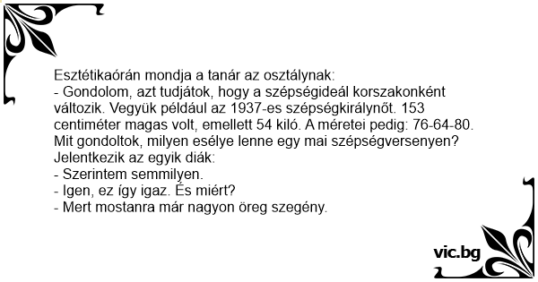 - Gondolom, azt tudjátok, hogy a szépségideál korszakonként változik. Vegyük például az 1937-es szépségkirálynőt. 153 centiméter magas volt, emellett 54 kiló. A méretei pedig: 76-64-80. Mit gondoltok, milyen esélye lenne egy mai szépségversenyen?