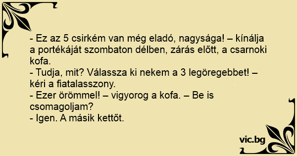 - Ez az 5 csirkém van még eladó, nagysága! – kínálja a portékáját szombaton délben, zárás előtt, a csarnoki kofa.