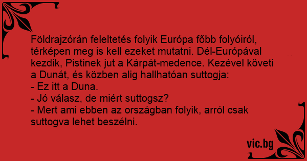 Földrajzórán feleltetés folyik Európa főbb folyóiról, térképen meg is kell ezeket mutatni. Dél-Európával kezdik, Pistinek jut a Kárpát-medence. Kezével követi a Dunát, és közben alig hallhatóan suttogja: