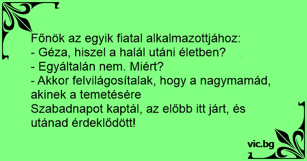 "Tror de på genopstandelse efter døden?", spurgte direktøren til en af sine ansatte. "Selvfølgelig gør jeg ikke det, hvorfor spørger de?" "Fordi deres bedstefar, der blev begravet i sidste uge, er...