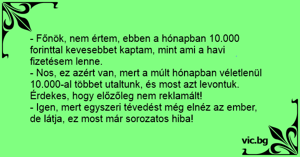 - Főnök, nem értem, ebben a hónapban 10.000 forinttal kevesebbet kaptam, mint ami a havi fizetésem lenne.