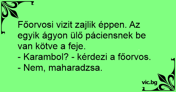 Főorvosi vizit zajlik éppen. Az egyik ágyon ülő páciensnek be van kötve a feje.