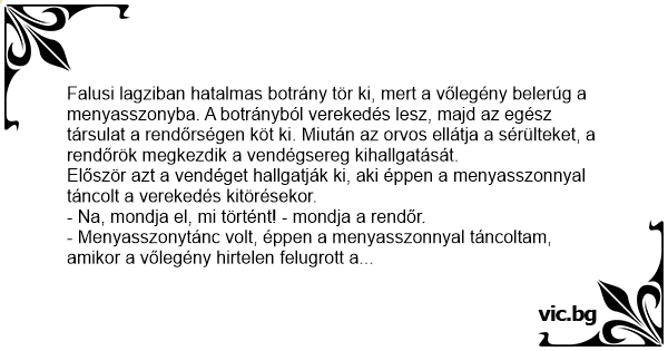 - Menyasszonytánc volt, éppen a menyasszonnyal táncoltam, amikor a vőlegény hirtelen felugrott a székéből, és minden ok nélkül a menyasszony lába közé rúgott!