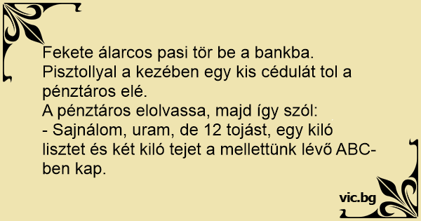 Fekete álarcos pasi tör be a bankba. Pisztollyal a kezében egy kis cédulát tol a pénztáros elé.