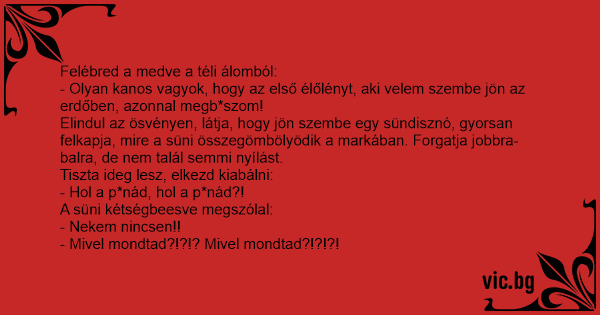 - Olyan kanos vagyok, hogy az első élőlényt, aki velem szembe jön az erdőben, azonnal megb*szom!