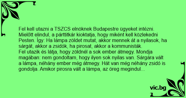 Fel kell utazni a TSZCS elnöknek Budapestre ügyeket intézni. Mielőtt elindul, a párttitkár kioktatja, hogy miként kell közlekedni Pesten. Így: Ha lámpa zöldet mutat, akkor mennek át a nyilasok, ha sárgát, akkor a zsidók, ha pirosat, akkor a kommunisták.