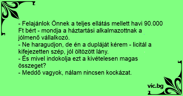 - Felajánlok Önnek a teljes ellátás mellett havi 90.000 Ft bért - mondja a háztartási alkalmazottnak a jólmenő vállalkozó.