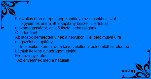 - Hölgyeim és uraim, itt a kapitány beszél. Elértük az utazómagasságot, az idő tiszta, sebességünk...