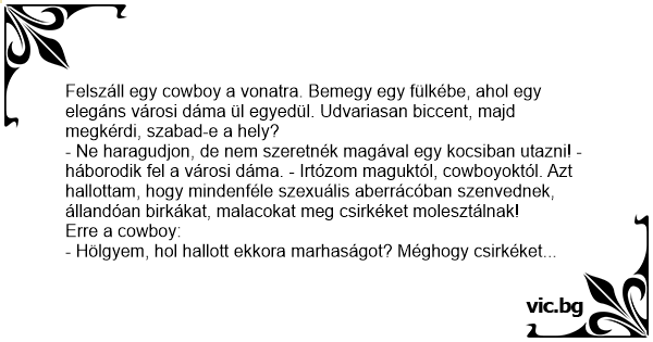 - Ne haragudjon, de nem szeretnék magával egy kocsiban utazni! - háborodik fel a városi dáma. - Irtózom maguktól, cowboyoktól. Azt hallottam, hogy mindenféle szexuális aberrácóban szenvednek, állandóan birkákat, malacokat meg csirkéket molesztálnak!