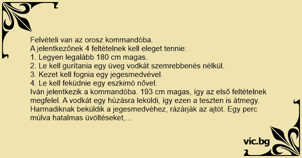 Iván jelentkezik a kommandóba. 193 cm magas, így az első feltételnek megfelel. A vodkát egy húzásra leküldi, így ezen a teszten is átmegy.