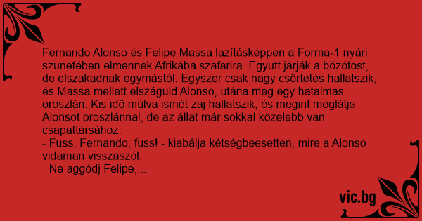 Fernando Alonso és Felipe Маssа lazításképpen a Forma-1 nyári szünetében elmennek Afrikába szafarira. Együtt járják a bózótost, de elszakadnak egymástól. Egyszer csak nagy csörtetés hallatszik, és Маssа mellett elszáguld Alonso, utána meg egy hatalmas oroszlán. Kis idő múlva ismét zaj hallatszik, és megint meglátja Alonsot oroszlánnal, de az állat már sokkal közelebb van csapattársához.