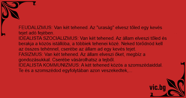 IDEALISTA SZOCIALIZMUS: Van két tehened. Az állam elveszi tőled és berakja a közös istállóba, a többiek tehenei közé. Neked törődnöd kell az összes tehénnel, cserébe az állam ad egy kevés tejet.