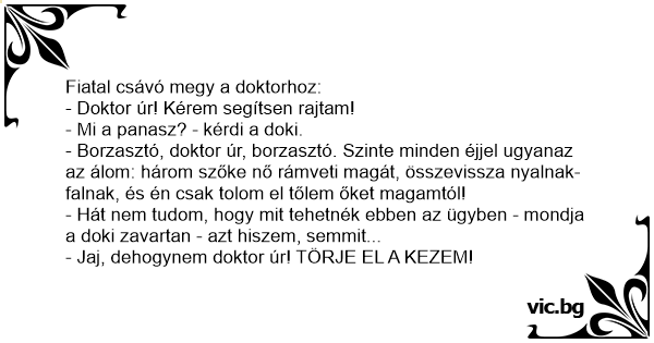 - Borzasztó, doktor úr, borzasztó. Szinte minden éjjel ugyanaz az álom: három szőke nő rámveti magát, összevissza nyalnak-falnak, és én csak tolom el tőlem őket magamtól!