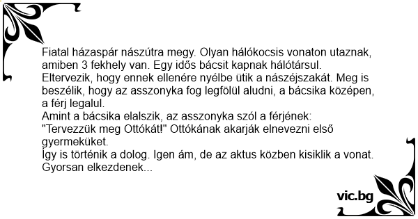 Fiatal házaspár nászútra megy. Olyan hálókocsis vonaton utaznak, amiben 3 fekhely van. Egy idős bácsit kapnak hálótársul.