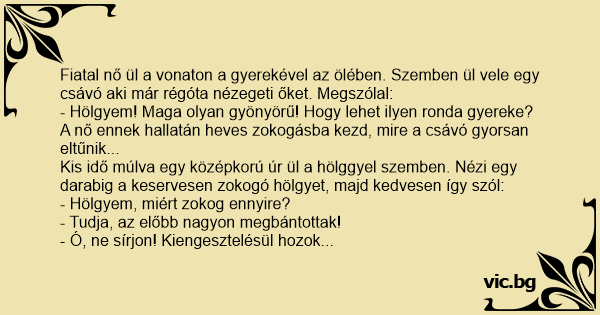 Fiatal nő ül a vonaton a gyerekével az ölében. Szemben ül vele egy csávó aki már régóta nézegeti őket. Megszólal: