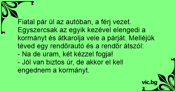 Fiatal pár ül az autóban, a férj vezet. Egyszercsak az egyik kezével elengedi a kormányt és átkarolja vele a párját. Melléjük téved egy rendőrautó és a rendőr átszól: