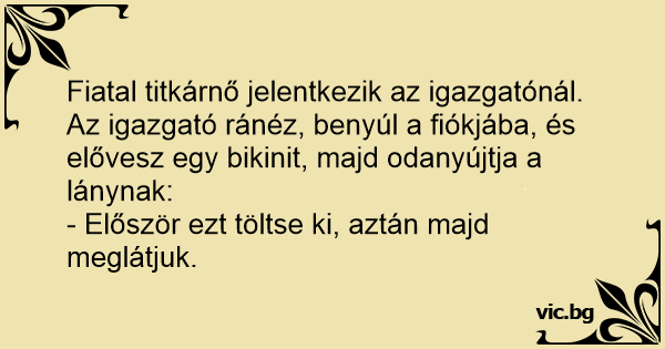 Az igazgató ránéz, benyúl a fiókjába, és elővesz egy bikinit, majd odanyújtja a lánynak: