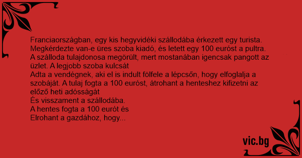 Adta a vendégnek, aki el is indult fölfele a lépcsőn, hogy elfoglalja a szobáját. A tulaj fogta a 100 euróst, átrohant a henteshez kifizetni az előző heti adósságát