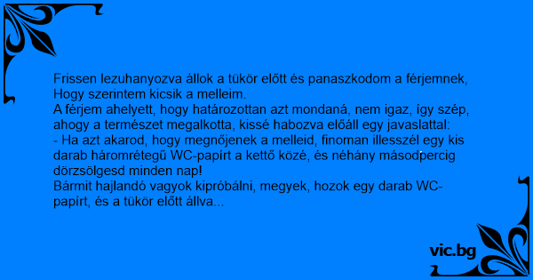 - Gondolod, hogy ha mindennap WC-papírral dörzsölgetem a melleim közét, attól megnő néhány év alatt?