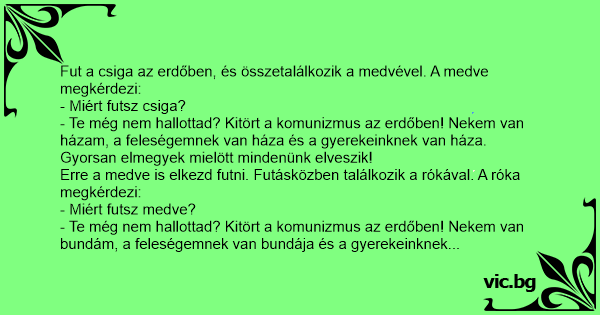 - Te még nem hallottad? Kitört a komunizmus az erdőben! Nekem van bundám, a feleségemnek van bundája és a gyerekeinknek is van bundája. Gyorsan elmegyek mielött mindenünk elveszik!
