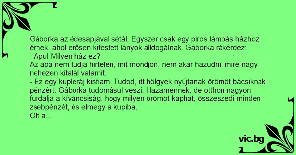 - Ez egy kupleráj kisfiam. Tudod, itt hölgyek nyújtanak örömöt bácsiknak pénzért. Gáborka tudomásul veszi. Hazamennek, de otthon nagyon furdalja a kíváncsiság, hogy milyen örömöt kaphat, összeszedi minden zsebpénzét, és elmegy a kupiba.