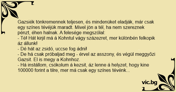 - Drága Gazsikám! Az a helyzet, hogy gondolkoztam, amíg te odahaza voltál, és be kellett látnom, hogy ez még nem elég. Te alkalmi munkákból és segélyből élsz. Nem lehetek biztos, hogy meg tudod-e adni ezt a sok pénzt. De van egy ötletem. Most itthagyod a felét, és a másik 100ezret majd tavasszal megadod, jó?