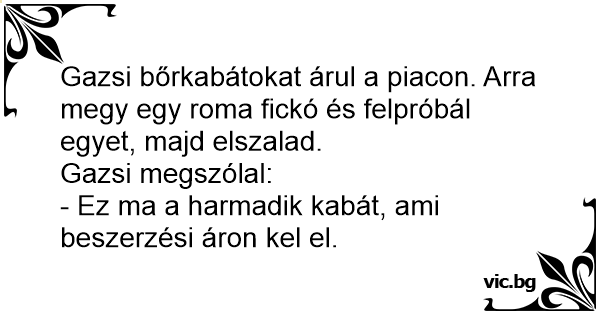 Gazsi bőrkabátokat árul a piacon. Arra megy egy roma fickó és felpróbál egyet, majd elszalad.