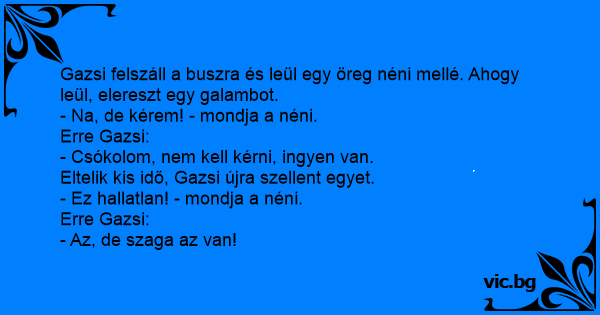 Gazsi felszáll a buszra és leül egy öreg néni mellé. Ahogy leül, elereszt egy galambot.