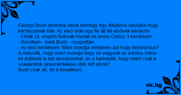 George Bush amerikai elnök bemegy egy általános iskolába hogy kérdezzenek tőle. Az első órán egy fiú áll fel elsőnek kérdezni: