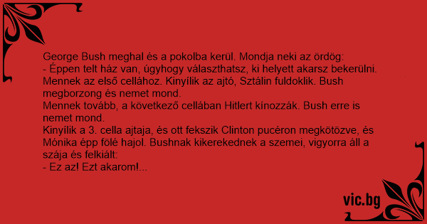 George Bush meghal és a pokolba kerül. Mondja neki az ördög: