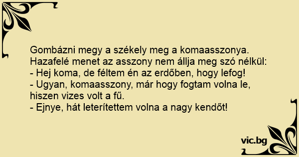 Gombázni megy a székely meg a komaasszonya. Hazafelé menet az asszony nem állja meg szó nélkül: - Hej koma, de féltem én az erdőben, hogy lefog! - Ugyan, komaasszony, már hogy fogtam volna le, hiszen vizes volt a fű. - Ejnye, hát leterítettem volna a nagy kendőt!