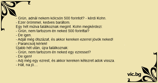 - Grün, adnál nekem kölcsön 500 forintot? - kérdi Kohn.