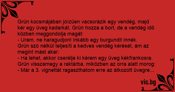 Grün kocsmájában jóízűen vacsorázik egy vendég, majd kér egy üveg kadarkát. Grün hozza a bort, de a vendég idő közben meggondolja magát: