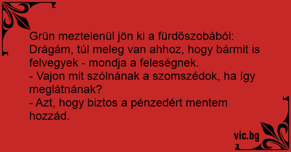 Drágám, túl meleg van ahhoz, hogy bármit is felvegyek - mondja a feleségnek.