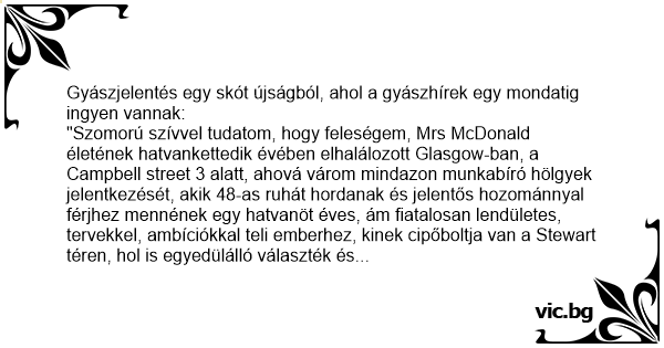 "Szomorú szívvel tudatom, hogy feleségem, Mrs McDonald életének hatvankettedik évében elhalálozott Glasgow-ban, a Campbell street 3 alatt, ahová várom mindazon munkabíró hölgyek jelentkezését, akik 48-as ruhát hordanak és jelentős hozománnyal férjhez mennének egy hatvanöt éves, ám fiatalosan lendületes, tervekkel, ambíciókkal teli emberhez, kinek cipőboltja van a Stewart téren, hol is egyedülálló választék és mérsékelt árak várják továbbra is a tisztelt vásárlóközönséget, vasárnap kivételével mindennap, reggel nyolctól este hatig."