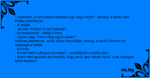 - Gyerekek, ki tud nekem mondani egy nagy folyót? - kérdezi a tanító néni.