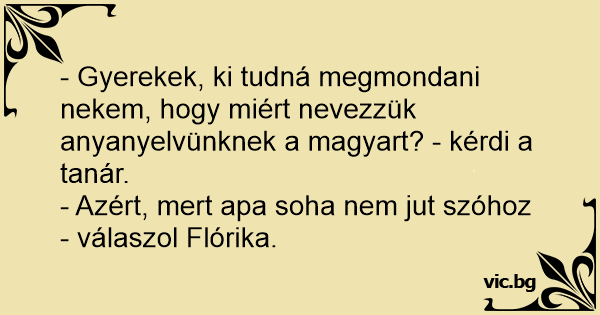 - Gyerekek, ki tudná megmondani nekem, hogy miért nevezzük anyanyelvünknek a magyart? - kérdi a tanár.