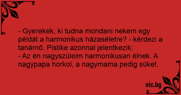 - Gyerekek, ki tudna mondani nekem egy példát a harmonikus házaséletre? - kérdezi a tanárnő. Pistike azonnal jelentkezik: