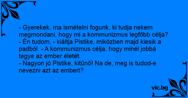 - Én tudom, - kiáltja Pistike, miközben majd kiesik a padból. - A kommunizmus célja, hogy minél jobbá tegye az ember életét.