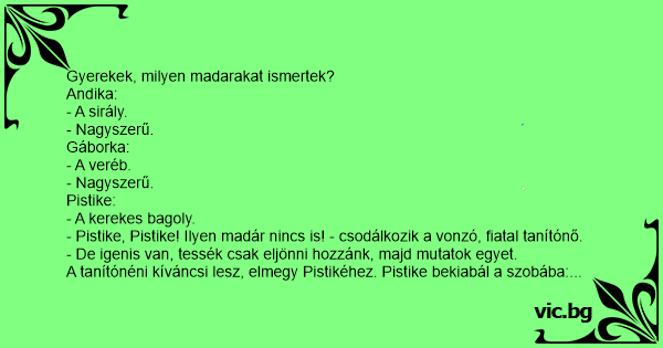 - Pistike, Pistike! Ilyen madár nincs is! - csodálkozik a vonzó, fiatal tanítónő.