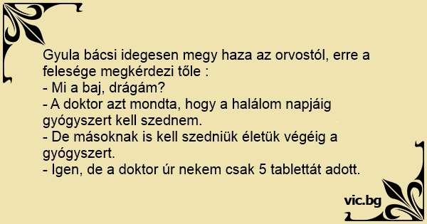 Gyula bácsi idegesen megy haza az orvostól, erre a felesége megkérdezi tőle :