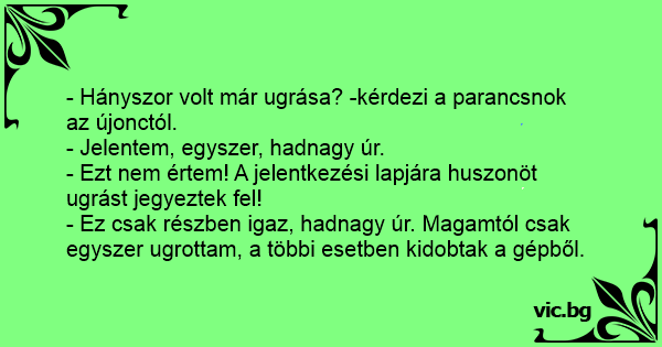 - Hányszor volt már ugrása? -kérdezi a parancsnok az újonctól.
