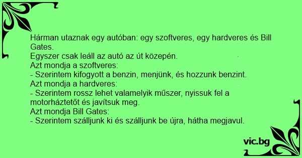 Hárman utaznak egy autóban: egy szoftveres, egy hardveres és Bill Gates.
