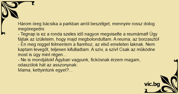 Három öreg bácsika a parkban arról beszélget, mennyire rossz dolog megöregedni. - Tegnap is ez a ronda szeles idő nagyon megviselte a reumámat! Úgy fájtak az ízületeim, hogy majd megbolondultam. A reuma, az borzasztó! - Én meg reggel felmentem a fiamhoz, az első emeleten laknak. Nem kaptam levegőt, teljesen kifulladtam. A szív, a szív! Csak az működne most is úgy mint régen... - Ne is mondjátok! Ágyban vagyunk, fickósnak érzem magam, odaszólok hát az asszonynak: Mama, kettyintünk egyet? Erre mit válaszol: meg vagy te húzatva öreg, 10 perce kettyintettünk! Jaj, a memória, a memória nem a régi már!