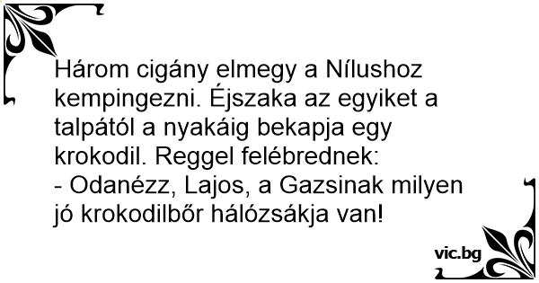 Három cigány elmegy a Nílushoz kempingezni. Éjszaka az egyiket a talpától a nyakáig bekapja egy krokodil. Reggel felébrednek: