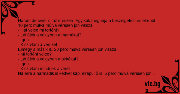 Három denevér lóg a fán. Azt mondja az egyik: - Nagyon éhes vagyok, mindjárt jövök. Kis idő múlva megjön, véresek a fogai. - Hát te merre jártál? - Látjátok azt a házat? - Látjuk. - Oda bementem,...